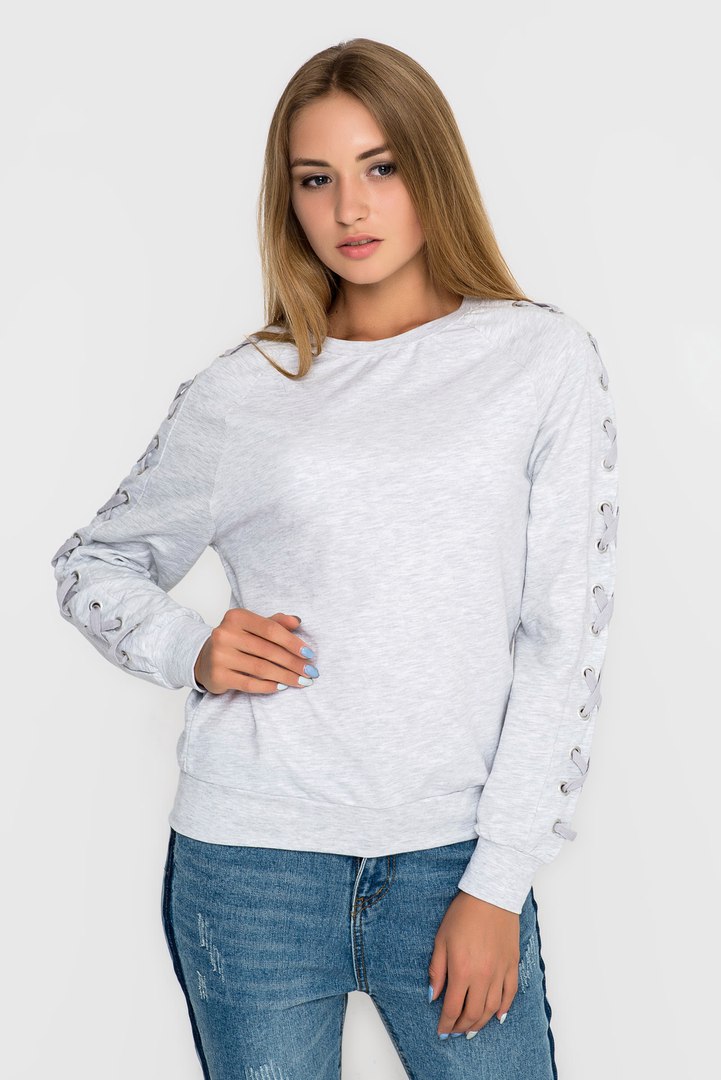Кофта женская, повседневная, прямого силуэта из трикотаж-коттона. Полочка и спинка цельнокроеные, низ - манжет из основной ткани. Рукав реглан, длинный, по внешней стороне от горловины до низа вставка, декорированная люверсами и шнуровкой, манжет из основной ткани.
