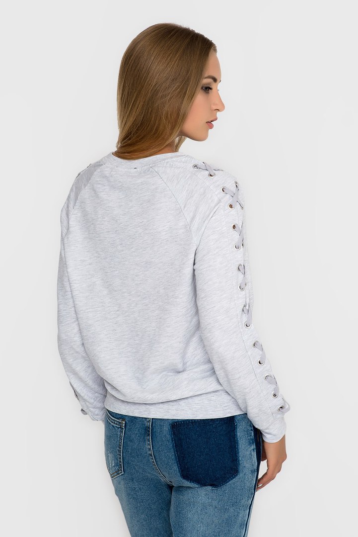 Кофта женская, повседневная, прямого силуэта из трикотаж-коттона. Полочка и спинка цельнокроеные, низ - манжет из основной ткани. Рукав реглан, длинный, по внешней стороне от горловины до низа вставка, декорированная люверсами и шнуровкой, манжет из основной ткани.