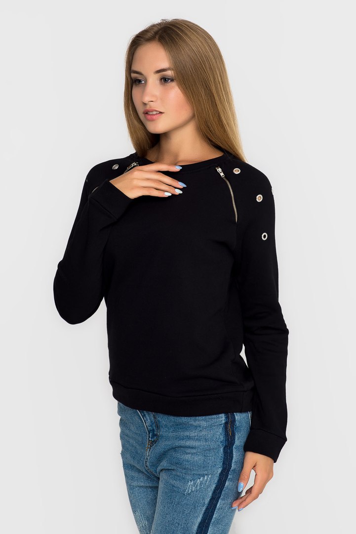 Кофта женская, повседневная, прямого силуэта из трикотаж-коттона. Полочка и спинка цельнокроеные, низ - манжет из основной ткани. Рукав реглан, длинный, на плече декорированный люверсами и декоративной змейкой молнией в передней части проймы, манжет из основной ткани.