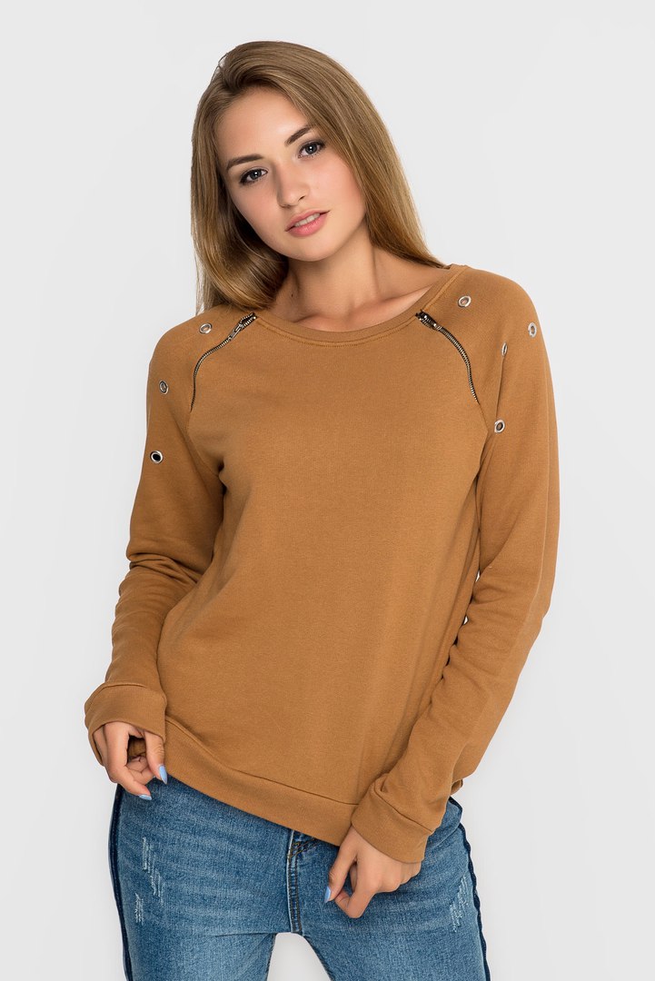 Кофта женская, повседневная, прямого силуэта из трикотаж-коттона. Полочка и спинка цельнокроеные, низ - манжет из основной ткани. Рукав реглан, длинный, на плече декорированный люверсами и декоративной змейкой молнией в передней части проймы, манжет из основной ткани.