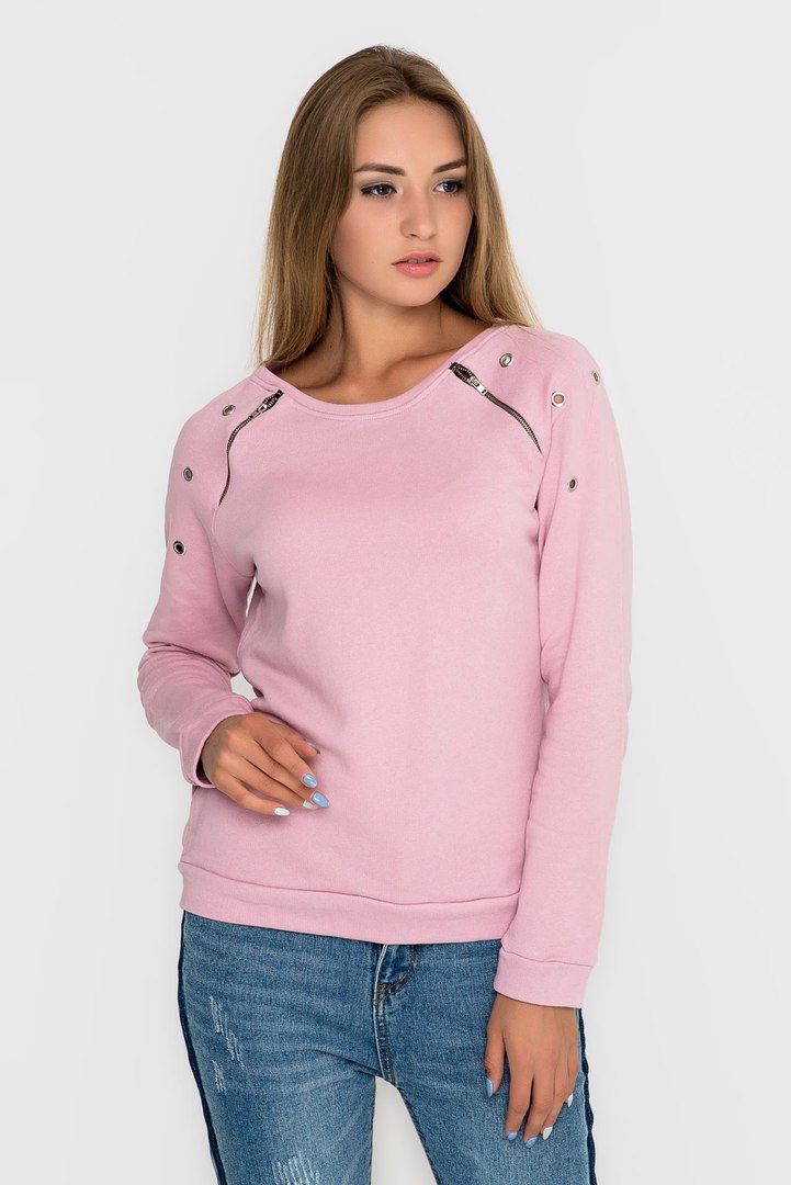 Кофта женская, повседневная, прямого силуэта из трикотаж-коттона. Полочка и спинка цельнокроеные, низ - манжет из основной ткани. Рукав реглан, длинный, на плече декорированный люверсами и декоративной змейкой молнией в передней части проймы, манжет из основной ткани.