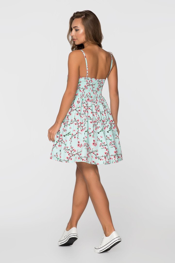 Сарафан с V-образным вырезом на тонких регулируемых бретелях. Юбка-солнце, присборенная по линии талии, в боковых швах карманы.